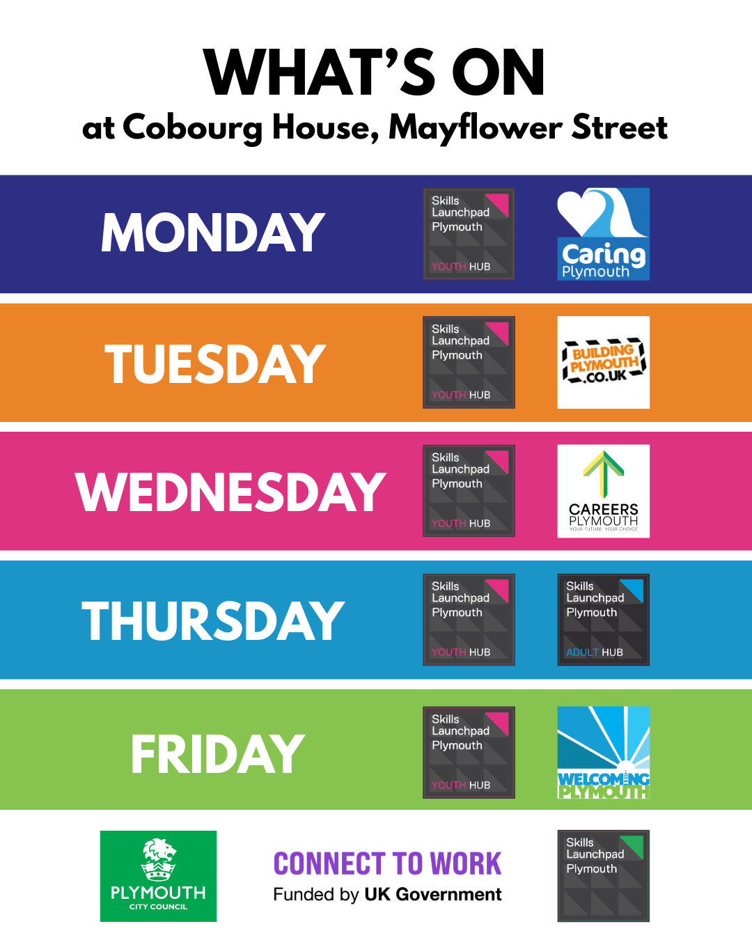 Based at Cobourg House (32 Mayflower Street), Skills Launchpad Plymouth offers bookable face-to-face appointments and a weekly programme of activities for both young people and adults.